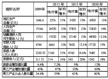 ——到2015年,旅游管理、营销、服务和产品开发的市场化、国际化水平显著提升,旅游产业的规模、质量、效益明显提高,旅游对经济增长和社会发展的拉动作用进一步增强。力争全省人均生产总值、城乡居民收入达到全国中上水平,教育、卫生、文化、社会保障等社会事业发展水平明显提高,综合生态环境质量保持全国领先水平。接待国内外游客达到4760万人天次,旅游总收入540亿元,旅游业增加值占地区生产总值比重达到9%以上,第三产业增加值占地区生产总值比重达到50%以上,第三产业从业人数比重达到45%以上。